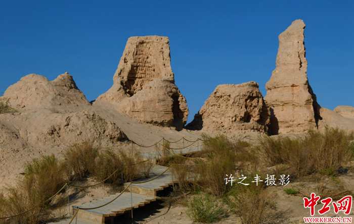 2019年9月30日,沿着古长城西行,走进甘肃瓜州锁阳城遗址,亦称“瓜州古城”。是集古城址、古河道、古寺院、古墓葬、古垦区等为一体的古文化遗存地。遗址结构可分为内外两城,将内城包围,墙体高大;内城面积28万平方米,城墙夯土版筑,底宽7.5米,顶宽4.6米,高10米,四角有角墩,结构极其复杂,城内留有大量土台、房屋及其它建筑物遗迹。这里的古代军事防御系统和烽燧信息传递系统是我国保存最为完好的典型范本,也是河西走廊规模较大保存完整的一座古城遗址。工人日报-中工网许之丰摄影报道
