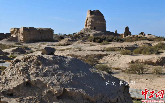 2019年9月30日,沿着古长城西行,走进甘肃瓜州锁阳城遗址,亦称“瓜州古城”。是集古城址、古河道、古寺院、古墓葬、古垦区等为一体的古文化遗存地。遗址结构可分为内外两城,将内城包围,墙体高大;内城面积28万平方米,城墙夯土版筑,底宽7.5米,顶宽4.6米,高10米,四角有角墩,结构极其复杂,城内留有大量土台、房屋及其它建筑物遗迹。这里的古代军事防御系统和烽燧信息传递系统是我国保存最为完好的典型范本,也是河西走廊规模较大保存完整的一座古城遗址。工人日报-中工网许之丰摄影报道