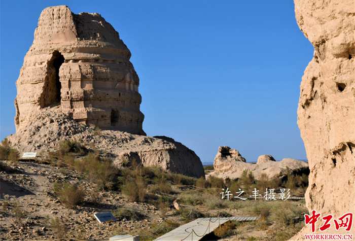 2019年9月30日,沿着古长城西行,走进甘肃瓜州锁阳城遗址,亦称“瓜州古城”。是集古城址、古河道、古寺院、古墓葬、古垦区等为一体的古文化遗存地。遗址结构可分为内外两城,将内城包围,墙体高大;内城面积28万平方米,城墙夯土版筑,底宽7.5米,顶宽4.6米,高10米,四角有角墩,结构极其复杂,城内留有大量土台、房屋及其它建筑物遗迹。这里的古代军事防御系统和烽燧信息传递系统是我国保存最为完好的典型范本,也是河西走廊规模较大保存完整的一座古城遗址。工人日报-中工网许之丰摄影报道