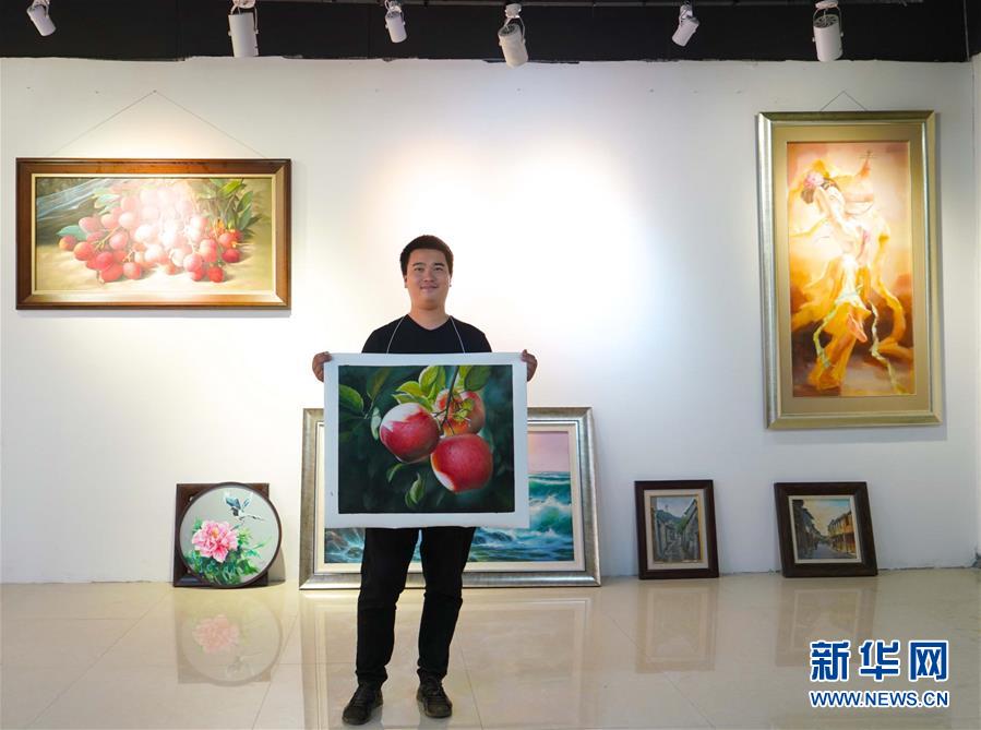 9月25日,周晶在江西省抚州市黎川县油画创意产业园展示他的油画作品。 新华社记者 胡晨欢摄