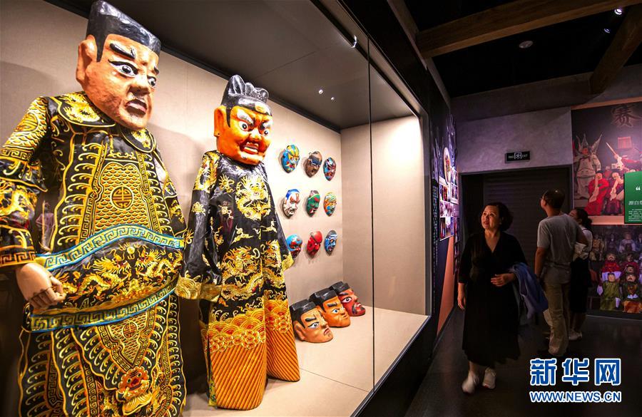 10月4日,参观者在武安博物馆参观赛戏展览。 国庆长假,河北省武安市不少市民来到武安博物馆参观,乐享假期。 新华社记者 王晓 摄