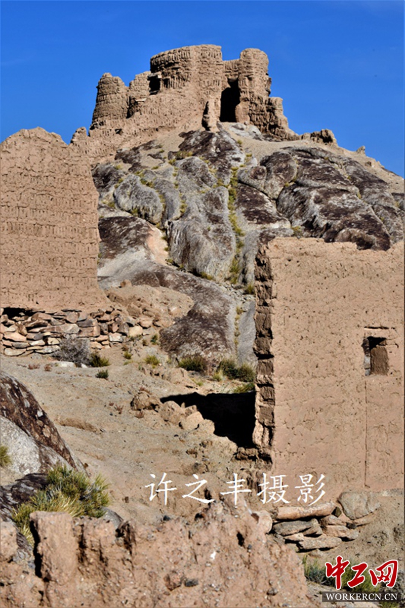 2019年10月4日,走进“明水军事要塞遗址”。这里地处新疆与甘肃交界的西北角,有一处古老的汉代前哨“明水军事要塞”,这里又被称作“半池泉”。四周山环绕的一块小盆地,面积约4平方公里。范围内分布着碉堡、战壕、营房、厨房、瞭望台等工事。这座曾经抵挡匈奴的要塞,历经两千多年风雨沧桑,从山顶的废墟中,依稀可见当年抵挡外敌的雄姿。工人日报-中工网许之丰摄影报道