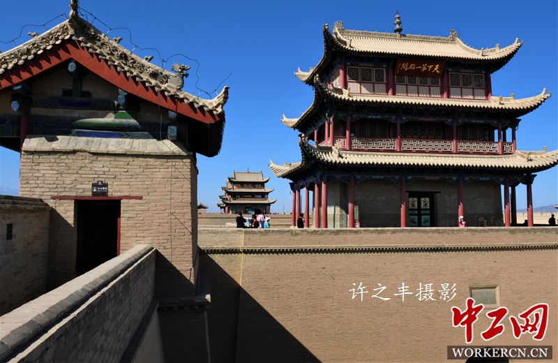2019年9月29日,走进明长城嘉峪关,这里号称“天下第一雄关”。位于甘肃省嘉峪关市西5千米处最狭窄的山谷中部,城关两侧的城墙横穿沙漠戈壁,北连黑山悬壁长城,是明长城最西端的关口,历史上曾被称为河西咽喉,因地势险要,建筑雄伟,有连陲锁钥之称。嘉峪关是古代“丝绸之路”的交通要塞,中国长城三大奇观之一(东有山海关、中有镇北台、西有嘉峪关)。工人日报-中工网许之丰摄影报道