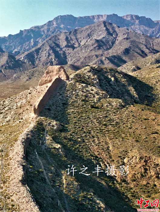 2019年10月7日,走进宁夏旧北长城,这里位于贺兰山脚下惠农区,人们通常称为红果子长城。旧北长城建于明朝嘉靖年间弘治以前,据史书记载“宁夏北,贺兰山,黄河之间,外有旧边墙一道。”所说的就是旧北长城,正好是镇远关的关墙。自古素有“关中屏障,河陇咽喉”之称,战略地位重要,从战国时期到秦、汉、隋、明几个朝代,都曾在宁夏修筑过长城。如今的旧北长城随着岁月的流逝,依然完好地保存着约5公里长的长城遗址,远远望去,依然不失当年的雄伟。工人日报-中工网许之丰摄影报道