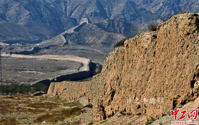 2019年10月7日,走进宁夏旧北长城,这里位于贺兰山脚下惠农区,人们通常称为红果子长城。旧北长城建于明朝嘉靖年间弘治以前,据史书记载“宁夏北,贺兰山,黄河之间,外有旧边墙一道。”所说的就是旧北长城,正好是镇远关的关墙。自古素有“关中屏障,河陇咽喉”之称,战略地位重要,从战国时期到秦、汉、隋、明几个朝代,都曾在宁夏修筑过长城。如今的旧北长城随着岁月的流逝,依然完好地保存着约5公里长的长城遗址,远远望去,依然不失当年的雄伟。工人日报-中工网许之丰摄影报道