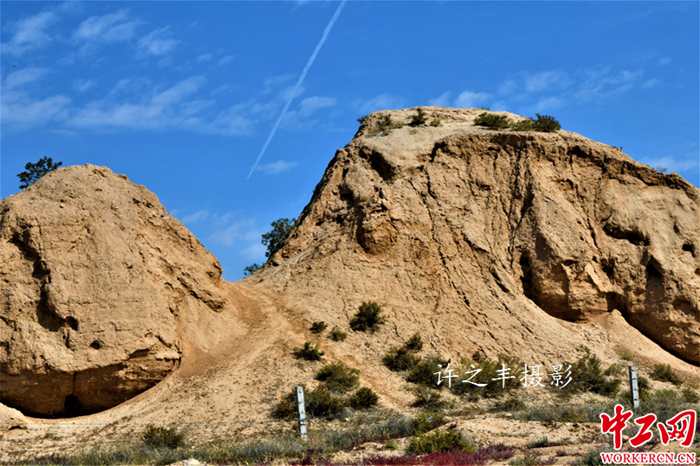 2019年10月8日,作者走进明长城银川段,始筑于明嘉靖十年,全长约10公里。境内自临河镇的横城堡黄河东岸,向东南延伸,经水洞沟、红山堡、清水营等地。长城墙体均为黄土夯筑而成,每隔150米至250米有一座凸出墙体的墩台。明代宁夏西长城、河东墙、长堤均从银川境内穿过,是历史文化名城银川宝贵的文化遗产。工人日报-中工网许之丰摄影报道
