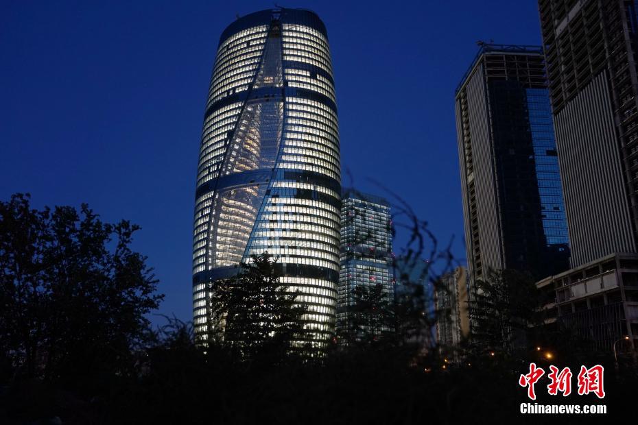 该建筑由两栋塔楼及近200米高的扭转造型中庭围合而成,这也创造了世界最高建筑中庭纪录。有网友将扭转中庭的造型评价为“夜空之眼”。据悉,该建筑将于近日开业。中新社记者 苏丹 摄