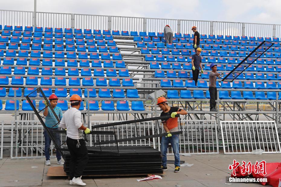10月9日,工作人员在上海世博庆典广场拆除已经搭建完成的椅凳。距离NBA中国赛还有不到一天的时间,除了各大媒体不转播NBA和NBA中国赛之外,多家赞助商也纷纷宣布暂停与NBA进行合作。中新社记者 殷立勤 摄