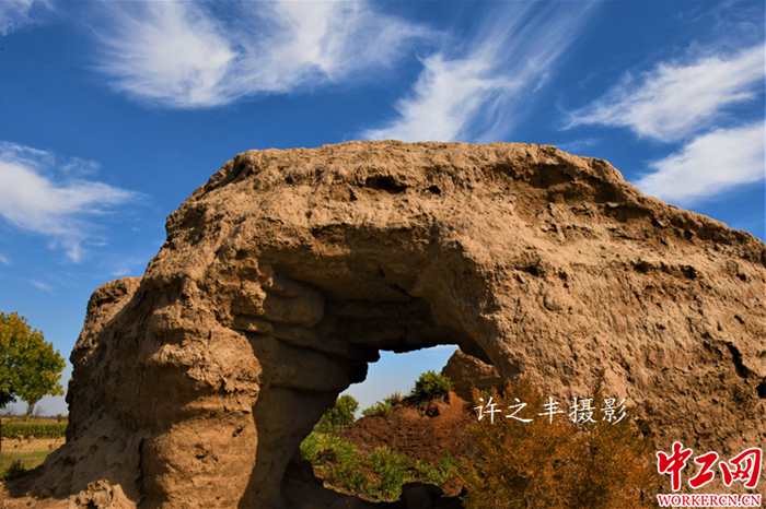 2019年10月7日,走进明长城角下的省嵬城遗址,它位于宁夏石嘴山市。始建于西夏时期,为守卫都城兴庆府(今宁夏银川)安全遗留下的古城遗址。现存城址略呈方形,城墙为黄土夯实,残城墙最高处尚有6米左右,基宽13米。宽阔的城区,平坦的地面,高大的城墙。一座气势宏大的古城遗址,历经上千年战争和风雨的洗礼尚有如此面貌,实属不易。工人日报-中工网许之丰摄影报道