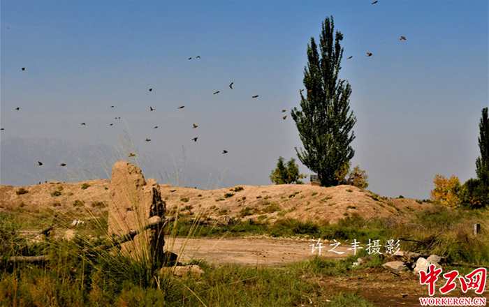 2019年10月7日,走进明长城角下的省嵬城遗址,它位于宁夏石嘴山市。始建于西夏时期,为守卫都城兴庆府(今宁夏银川)安全遗留下的古城遗址。现存城址略呈方形,城墙为黄土夯实,残城墙最高处尚有6米左右,基宽13米。宽阔的城区,平坦的地面,高大的城墙。一座气势宏大的古城遗址,历经上千年战争和风雨的洗礼尚有如此面貌,实属不易。工人日报-中工网许之丰摄影报道
