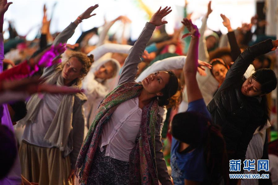 这是来自世界各地的瑜伽练习者在印度北阿肯德邦里希盖什举行的第16届国际瑜伽节开幕式上做瑜伽动作(2015年3月1日摄)。 新华社记者 郑焕松 摄