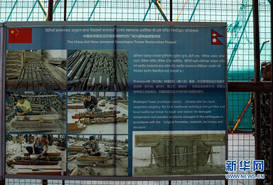 这是10月9日在尼泊尔加德满都杜巴广场九层神庙修复现场拍摄的展示中国和尼泊尔合作修复文物成果的展示牌。新华社记者 王婧嫱 摄