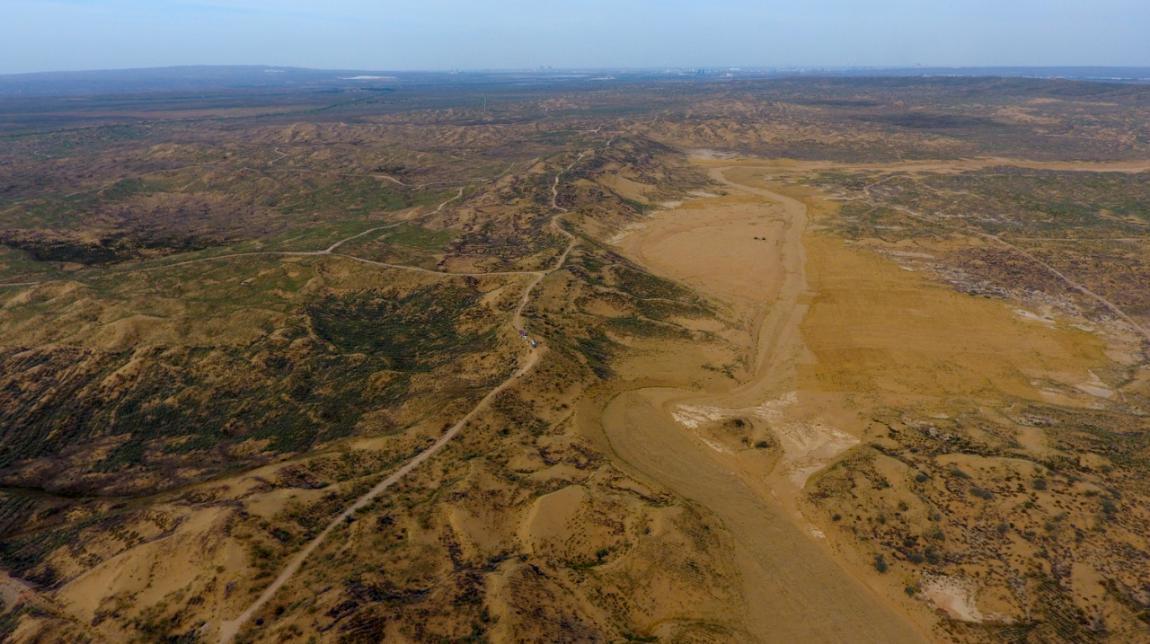 据地质学者考证,古时候毛乌素沙漠一带曾是水草肥美、风光宜人的牧场,明清以前,这里是“风吹草低见牛羊”的草原。由于气候变迁、干旱少雨、风多沙大,加之人口增长、畜群增加以及人为地滥垦乱挖,使草原退化、水土流失、植被衰败,土地荒漠化程度不断加重。再加上这里的浅层地表多是由沙硕物质组成,因而逐渐形成后来的沙漠、沙地。图为航拍的正在治理中的沙地(10月11日摄)。