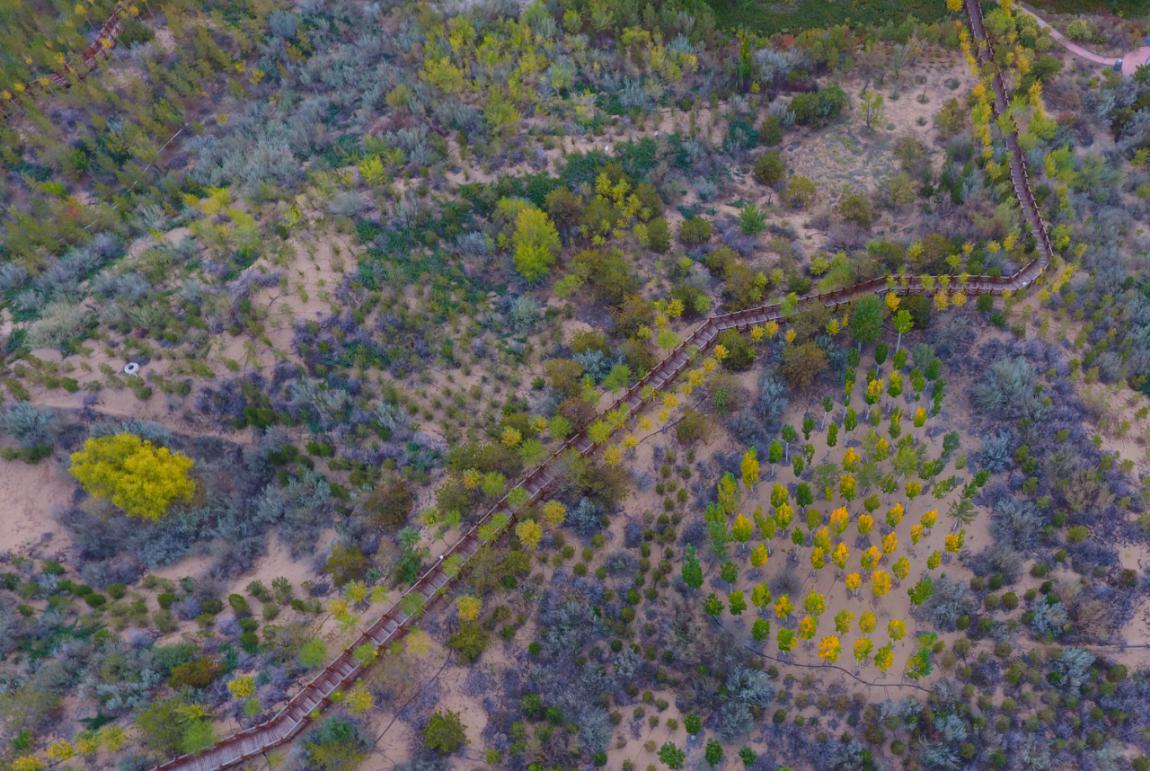 在“人民楷模”国家荣誉称号获得者,宁夏灵武白芨滩国家级自然保护区管理局原党委书记、局长王有德等带领下,通过多年探索,宁夏灵武白芨滩国家级自然保护区构建了符合实际、自成体系的治沙发展模式,累计治沙造林63万亩,控制流沙近百万亩,森林覆盖率达41%,筑起了阻止毛乌素沙地南移和西扩的“绿色长城”。图为航拍的宁夏灵武白芨滩国家级自然保护区(10月11日摄)。(杜文杰 张洁龙)