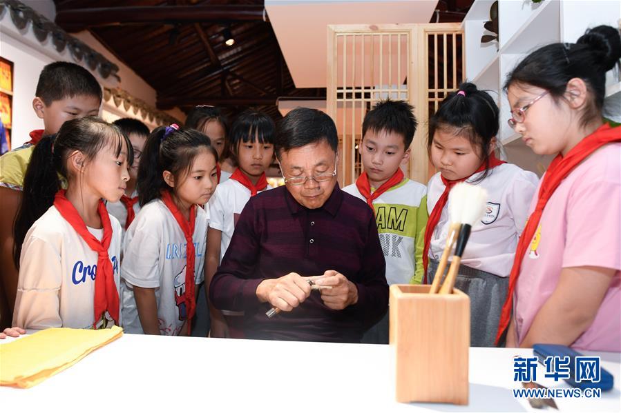 10月14日,湖笔制作技艺国家级代表性传承人邱昌明(右四)在非遗活态传承馆展示湖笔制作的择笔技能。 新华社记者 黄宗治 摄