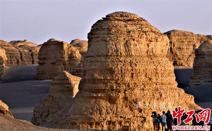 2019年10月1日,作者沿着汉长城西行,走进汉长城玉门关西北侧的雅丹地貌,大自然在这里创造出了许多奇观异景。这里的雅丹地貌属于古罗布泊的一部分,位于新疆与甘肃交界处。典型的雅丹地貌群落,布局有序、造型奇特、是一座罕见的天然雕塑博物馆,堪称古丝绸之路上的一道奇特景观。工人日报-中工网许之丰摄影报道