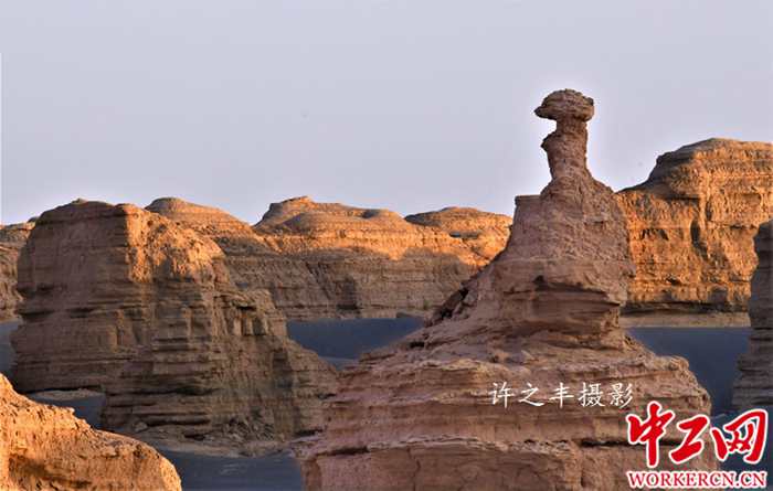2019年10月1日,作者沿着汉长城西行,走进汉长城玉门关西北侧的雅丹地貌,大自然在这里创造出了许多奇观异景。这里的雅丹地貌属于古罗布泊的一部分,位于新疆与甘肃交界处。典型的雅丹地貌群落,布局有序、造型奇特、是一座罕见的天然雕塑博物馆,堪称古丝绸之路上的一道奇特景观。工人日报-中工网许之丰摄影报道