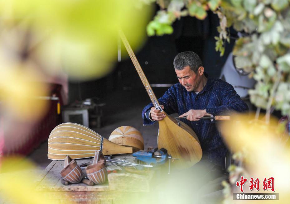 10月14日,新疆疏附县吐万克吾库沙克村,村民阿布都克热穆·吐尔逊在家中院落制作民族乐器。被誉为“中国新疆民族乐器村”的吐万克吾库沙克村,已有150多年的手工制作民族乐器的历史,所制作的传统乐器销往新疆各地及中亚、欧洲等国家。目前该村已有273户500余名村民靠制作乐器走上致富路。 中新社记者 刘新 摄
