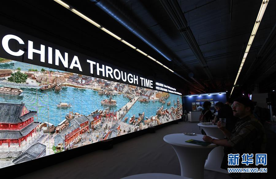 10月16日,在德国第71届法兰克福书展上,参观者在观看《穿越时空的中国》数字影像展。 以世界文化遗产中国大运河为创作背景的《穿越时空的中国》数字影像展16日在第71届法兰克福书展亮相,这是该影像展首次在海外展出,吸引众多参观者和业内人士关注。 展览由中国大百科全书出版社主办,以约2500年历史的中国大运河为创作背景,在百科全书式原创手绘历史长卷的基础上开发制作,依托高3米、长20余米的高清巨幕呈现,实现了三维动画与二维场景的融合。 新华社记者 逯阳 摄