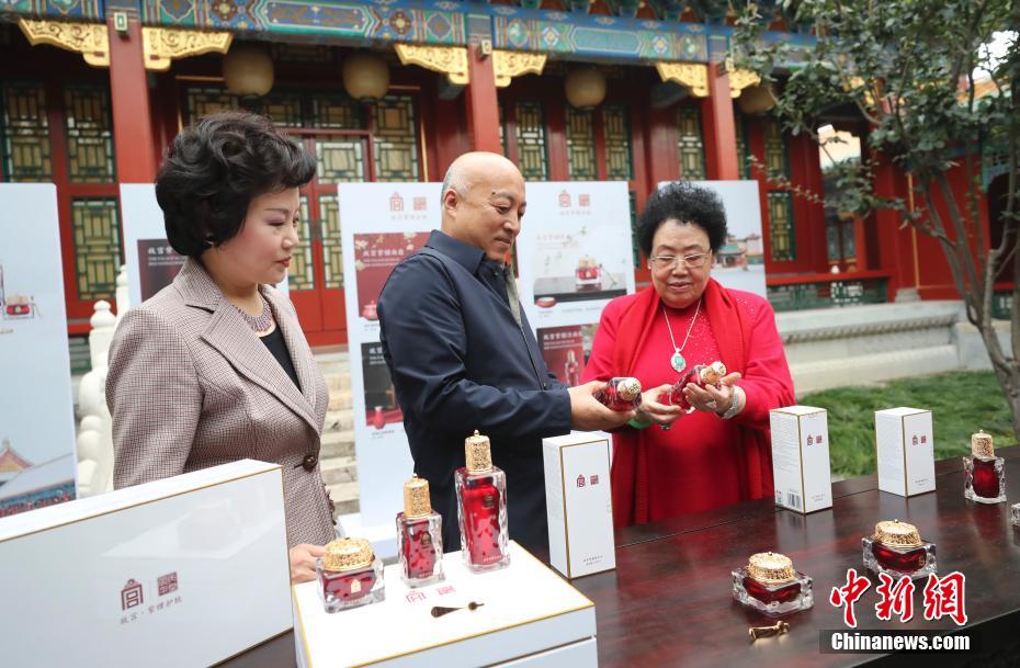 10月17日,北京故宫博物院与丽质华堂品牌合作产品“故宫紫檀护肤品”发布会在北京故宫建福宫花园举行。故宫博物院院长王旭东(中)和中国紫檀博物馆馆长、丽质华堂品牌创始人陈丽华(右)等出席发布会。中新社记者 杜洋 摄