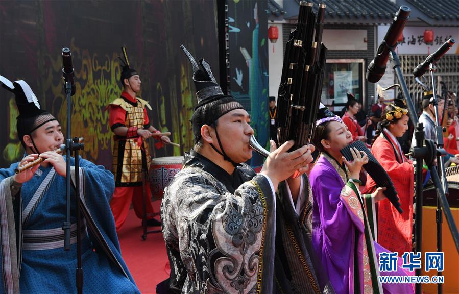 10月19日,在徐州市户部山历史街区,演员身着汉服演奏汉乐。 连日来,2019中国 (徐州)汉文化旅游节举行汉服嘉年华活动,为广大市民及汉服爱好者带来不一样的汉文化体验。身着各式汉服的市民演员随处可见,成为街头一道亮丽的风景。 新华社记者 陶明 摄