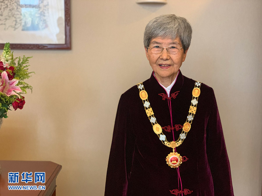 佩戴国家荣誉称号奖章的樊锦诗(9月29日摄)。 新华社发(敦煌研究院供图)
