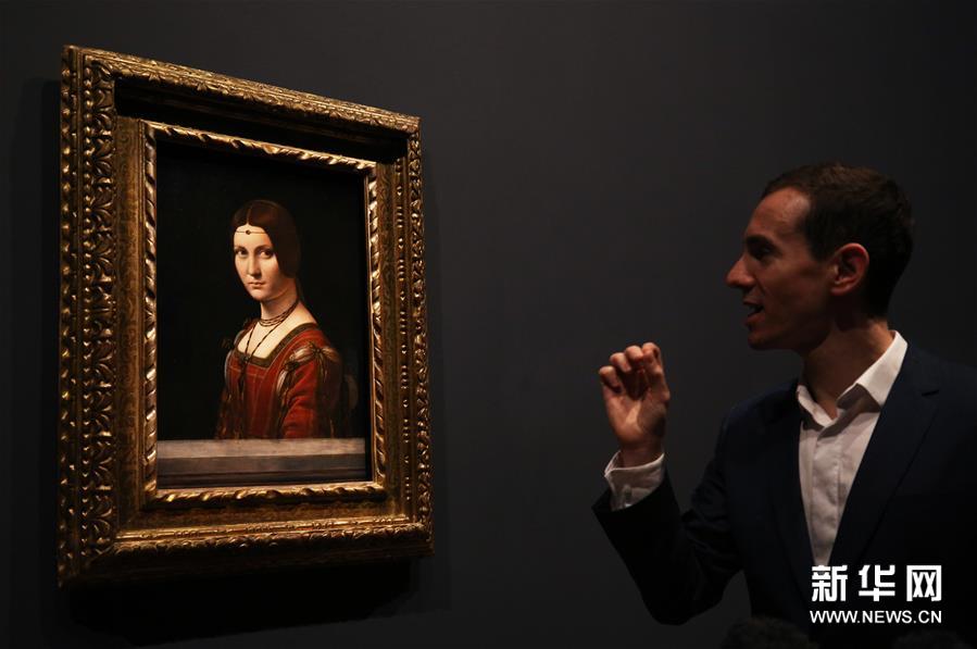 10月22日,在法国巴黎卢浮宫举办的达·芬奇绘画生涯回顾展媒体预展上,策展人为媒体记者们讲解《美丽的费隆妮叶夫人》。新华社记者 高静 摄