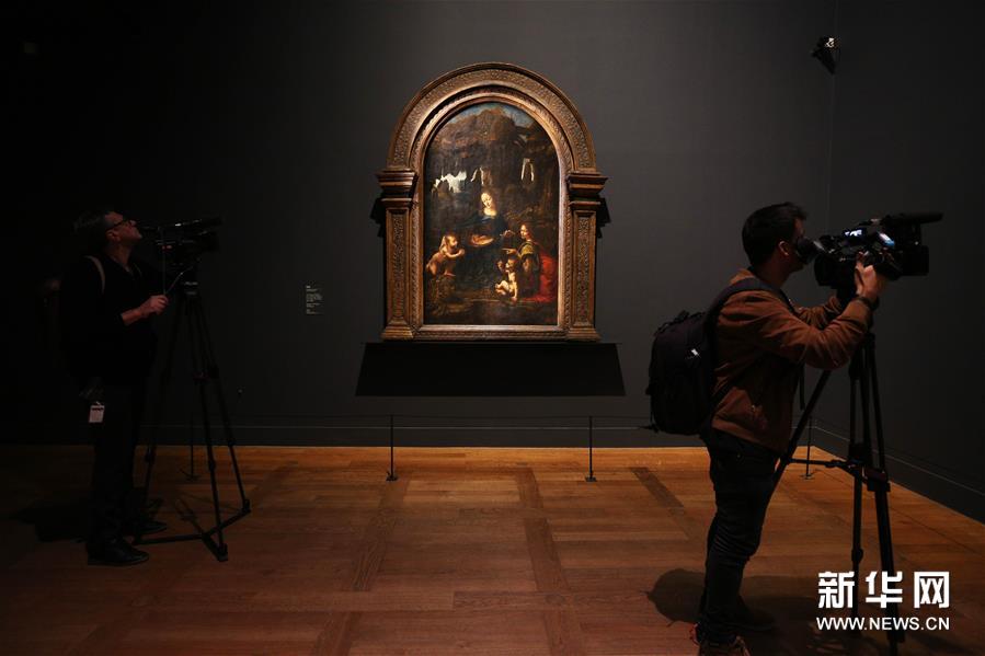 10月22日,在法国巴黎卢浮宫,一名摄像记者(左)在达·芬奇绘画生涯回顾展媒体预展上拍摄《岩间圣母》。新华社记者 高静 摄