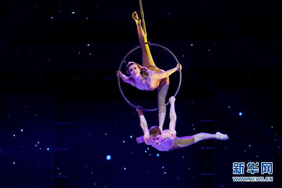 10月28日,美国和加拿大马戏演员在表演《双人吊环》。新华社记者 牟宇 摄