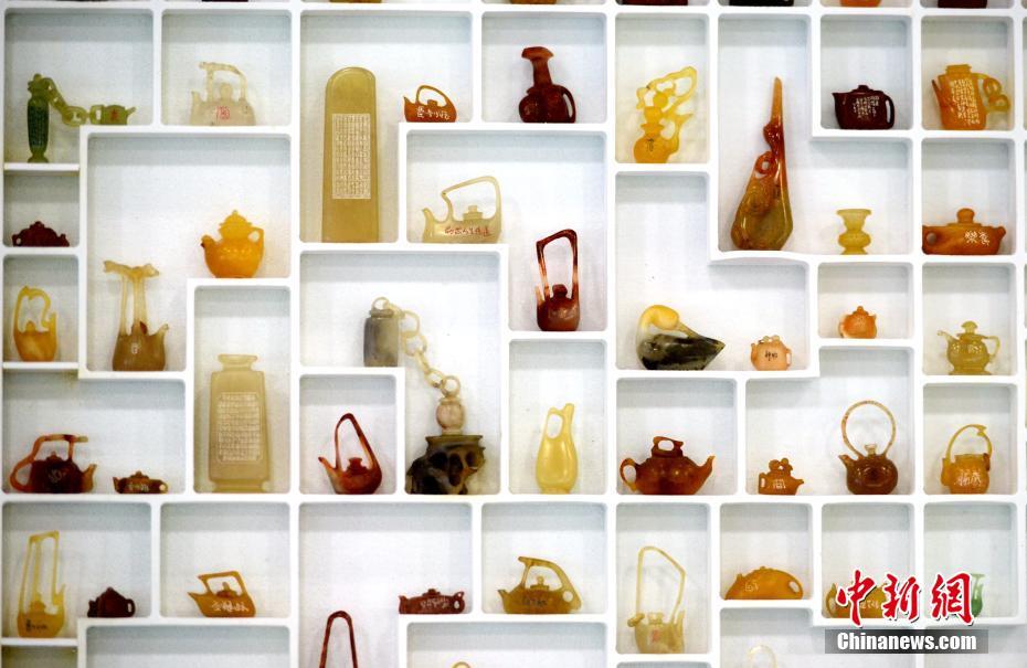 11月2日,福建省明溪县微雕技艺传承人毛祚胜在厦门展示微雕技艺,在细小的寿山石上雕刻出形态各异的壶件,让人惊叹。明溪微雕技艺为家族传承,至今已有近200年历史,毛祚胜是第七代传承人。图为形态各异的微雕壶件。中新社记者 王东明 摄