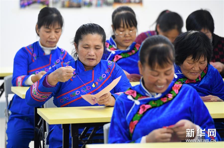 11月5日,群众在罗城易地扶贫搬迁仫佬家园安置区练习刺绣技艺。新华社记者 陆波岸 摄