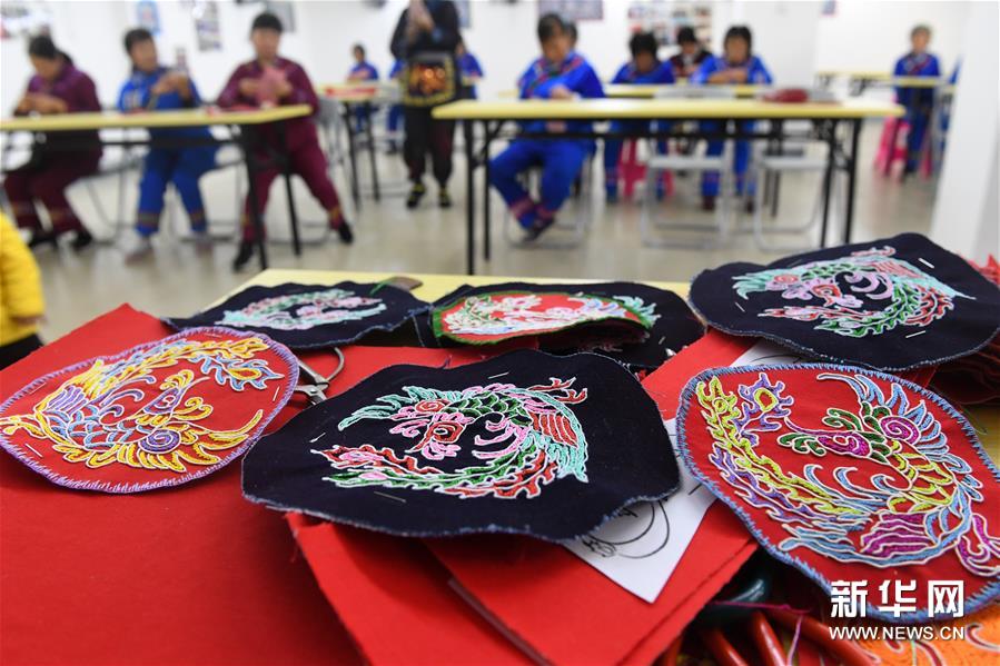 11月5日,群众在罗城易地扶贫搬迁仫佬家园安置区练习刺绣技艺。新华社记者 陆波岸 摄