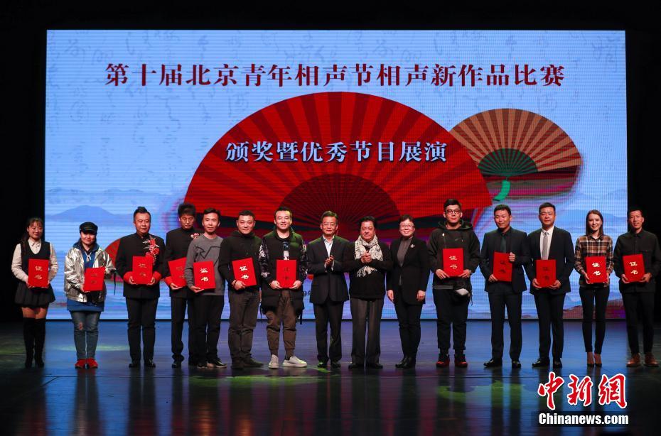 11月9日,第十届北京青年相声节相声新作品比赛颁奖暨优秀节目展演在天桥剧场举行。本届比赛启动以来,陆续收到北京、天津等12个省、直辖市、自治区报送的参赛作品,最终有36个作品进入决赛。图为相声名家李金斗(右七)等嘉宾为获得一等奖的选手颁奖并合影。中新社记者 贾天勇 摄