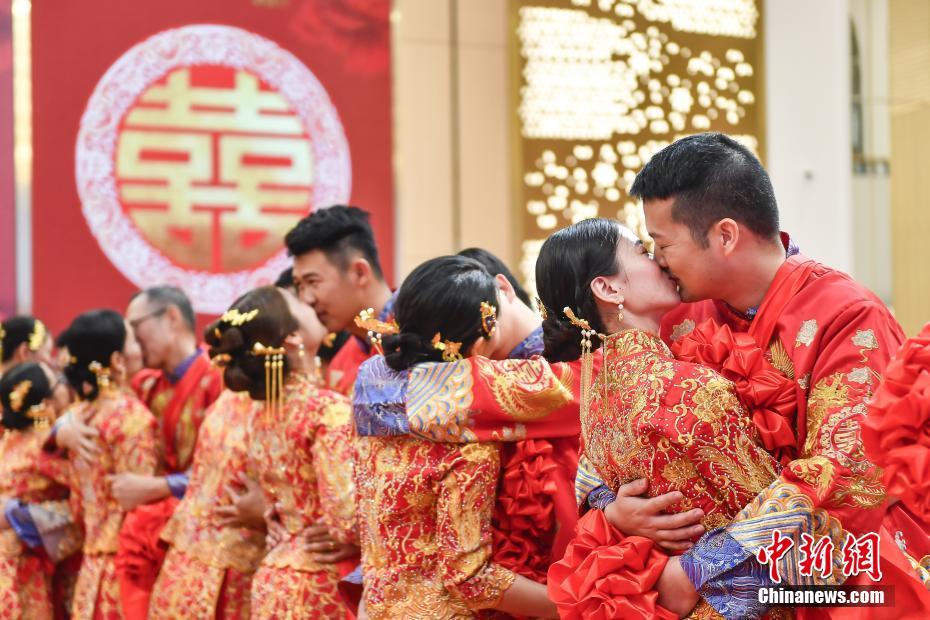11月11日,新娘与新郎在婚礼仪式上深情亲吻。当日,“幸福广州·浪漫起航”集体婚礼在广州市从化区温泉镇举行,30对新人身着中式礼服,举行传统婚礼仪式,结为百年之好。中新社记者 陈骥旻 摄
