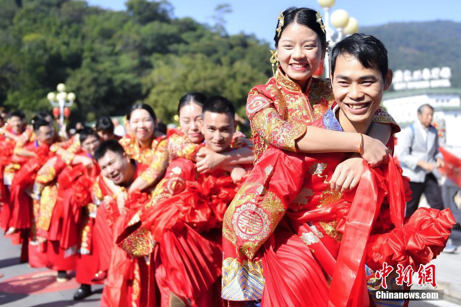 11月11日,新郎背起新娘步入礼堂。当日,“幸福广州·浪漫起航”集体婚礼在广州市从化区温泉镇举行,30对新人身着中式礼服,举行传统婚礼仪式,结为百年之好。中新社记者 陈骥旻 摄