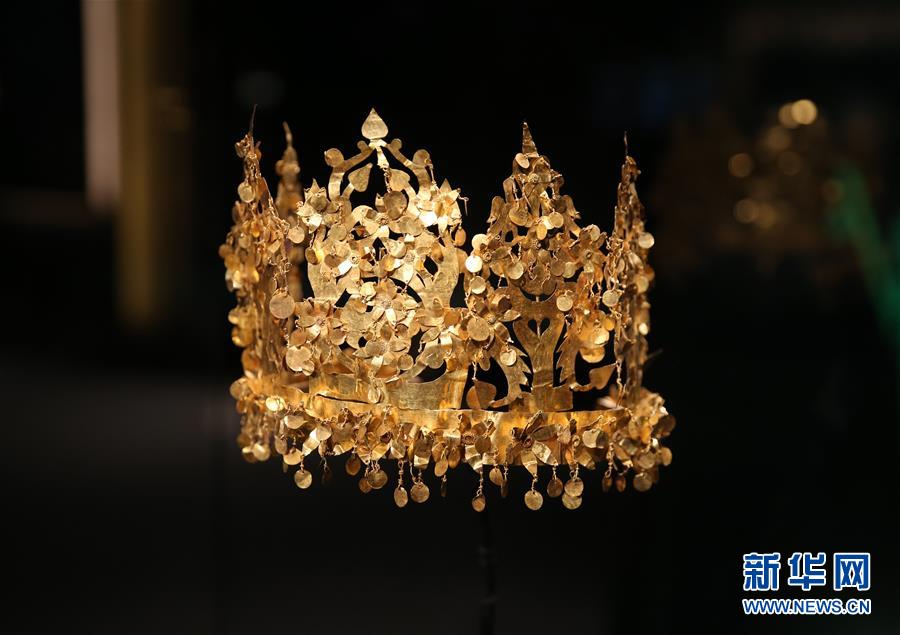 这是11月12日在香港历史博物馆拍摄的展品黄金王冠。 新华社记者 李震 摄