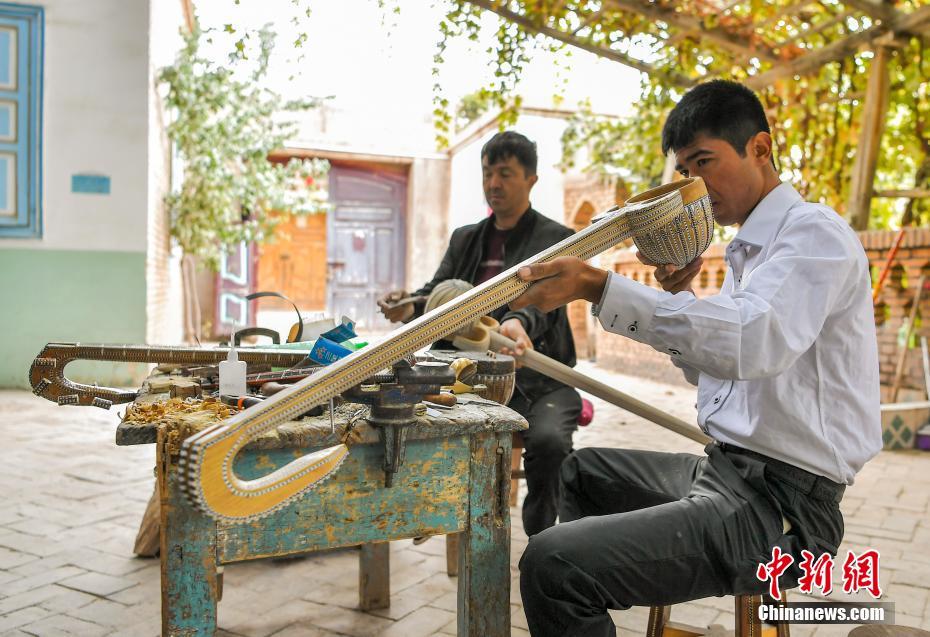 热合曼·阿布都的儿子阿布拉卡热·热合曼(左)和马穆提·热合曼(右)正在制作民族乐器。