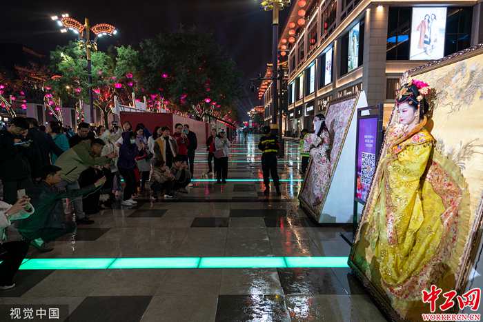 中工网讯 2019年11月12日,西安,大唐不夜城“贵妃画中人”表演亮相街头,两个女孩装扮成古装美女,身体“镶嵌”在画中,与背景融为一体,似乎是从画中走出一般。
