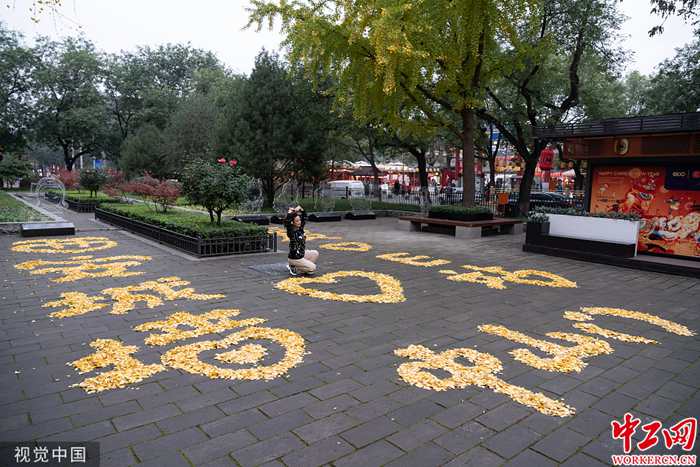 西安城墙景区工作人员用银杏叶“写字” 吸引游客拍照留念