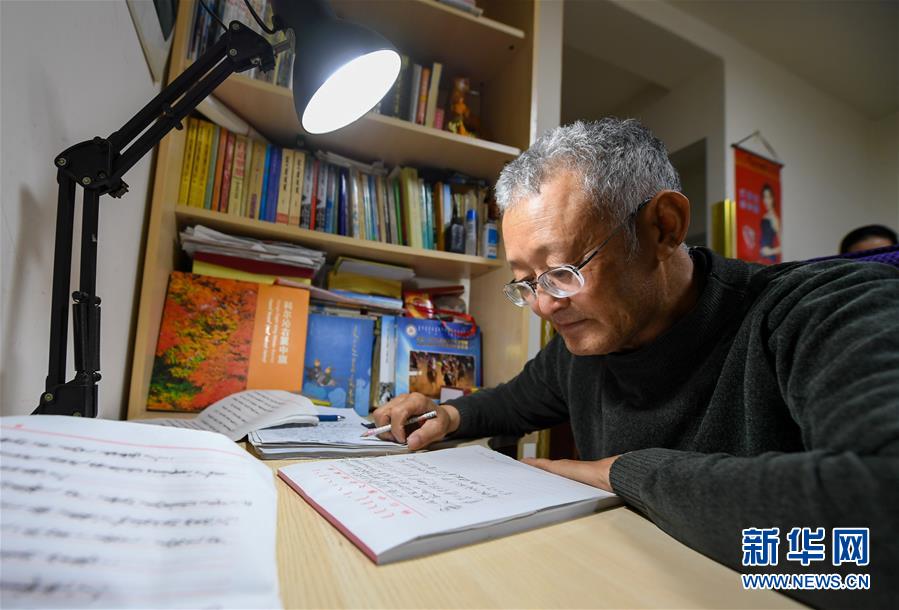 11月17日,消防“好来宝”义务宣传队队长宝音代来在家中创作新曲目。新华社记者 彭源 摄