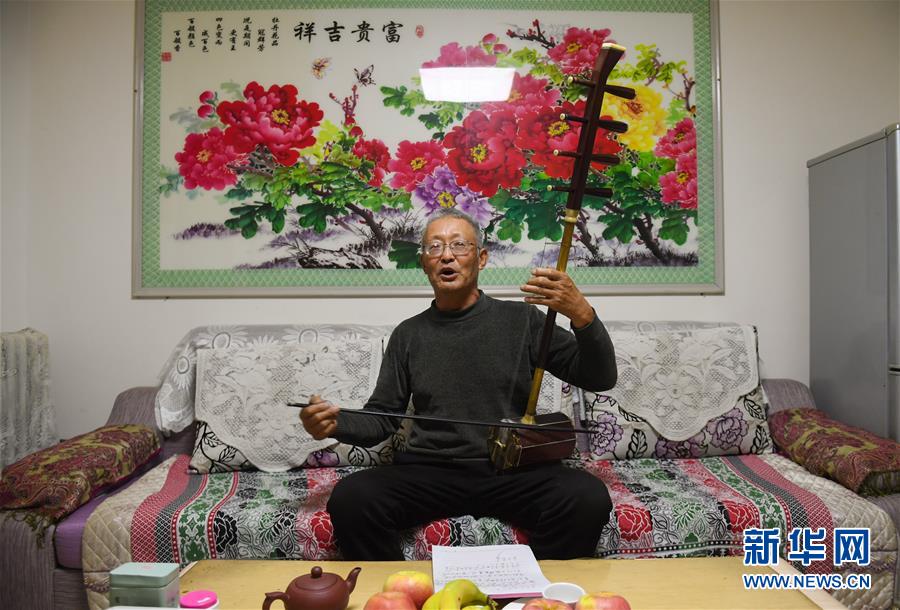 11月17日,消防“好来宝”义务宣传队队长宝音代来在家中试唱新创作的曲目。新华社记者 彭源 摄