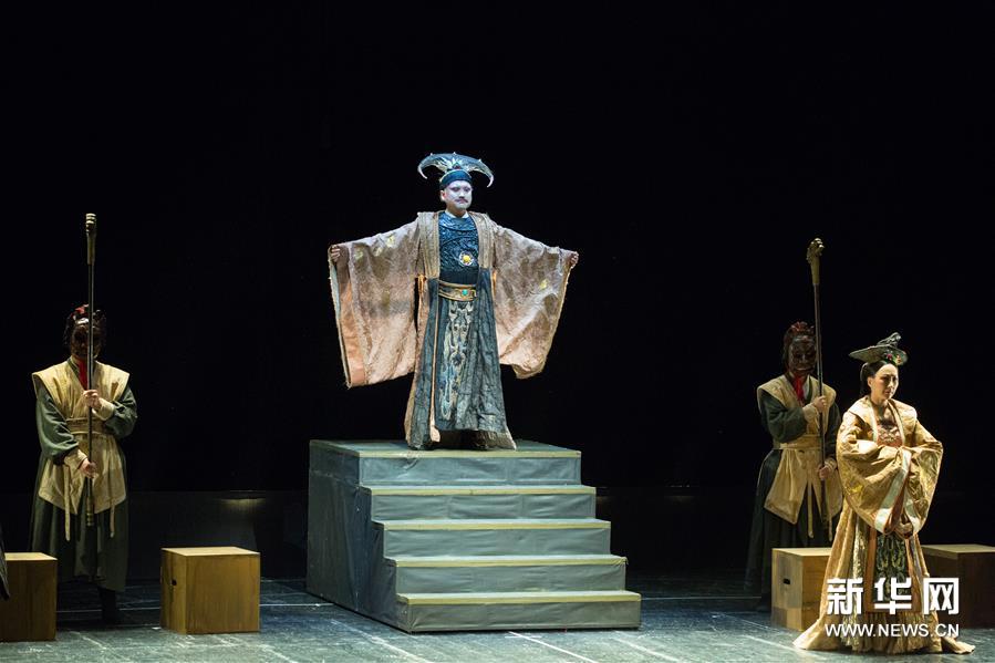 11月15日晚,在俄罗斯圣彼得堡,演员表演话剧《兰陵王》。 新华社发(莫京娜摄)
