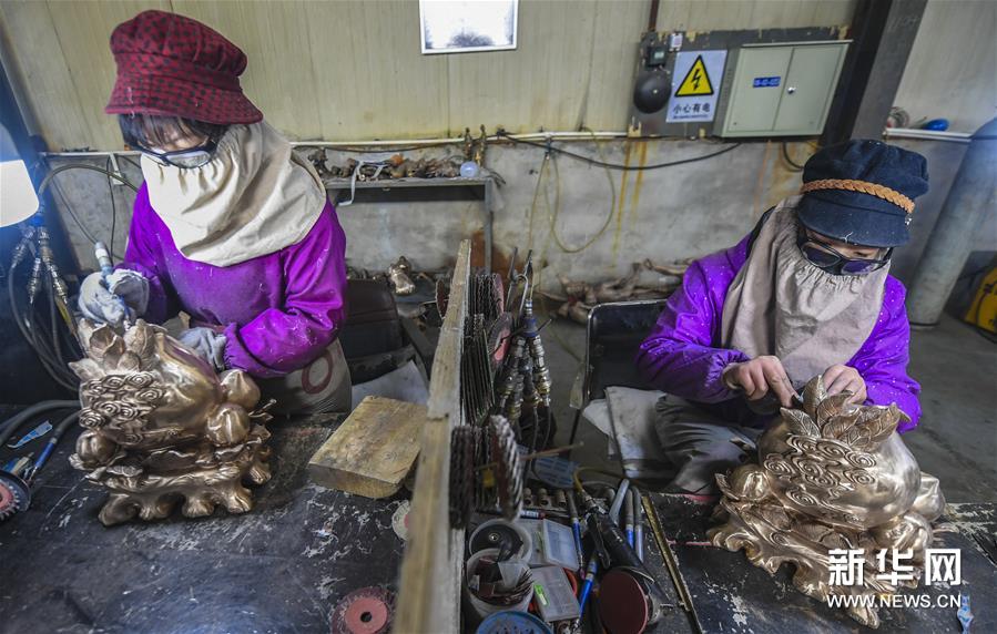 11月18日,饶阳县华日青铜文化产业园工人在精修青铜雕塑。河北省饶阳县华日青铜文化产业园成立于20世纪90年代,经过20余年的发展,形成了以设计生产各类雕塑艺术品为主的现代文化产业园。近年来,该产业园在传统青铜雕塑文化中注入时尚元素,并和清华美院、中央美院等院校合作,促进园区产、学、研一体化发展,雕塑产品远销美国、日本、德国、瑞典等地。新华社记者 李晓果 摄