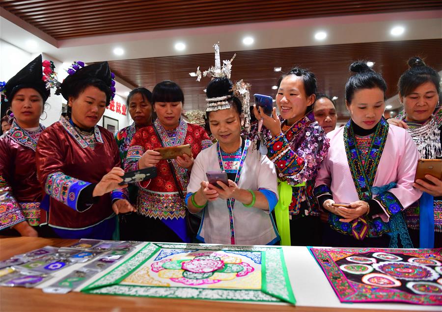 11月18日,在广西柳州市融水苗族自治县易地扶贫安置点苗家小镇“妇女之家巾帼扶贫车间”,妇女们在学习刺绣作品。