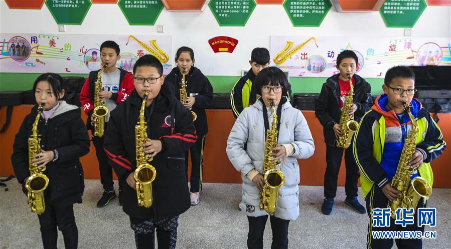 11月19日,河北省武强县周窝镇周窝学校的学生在吹奏萨克斯。 近年来,河北省武强县依托得天独厚的乐器产业基础,通过引进艺术学校、推广乐器进校园、打造全国音乐教育服务联盟(武强)基地等措施,大力培育音乐文化企业及音乐人才,积极构建乐器产业与音乐教育培训融合发展的新格局。 新华社记者 李晓果 摄
