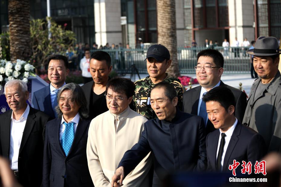 11月19日下午,第28届中国金鸡百花电影节金鸡雕塑揭幕仪式在厦门举行,众多导演、演员亮相仪式。金鸡雕塑由著名雕塑家、中国美术馆馆长吴为山(前排左二)创作,雕塑高6.91米,重超2吨,坐落于直径1981厘米的底座上,象征中国电影金鸡奖创始年份1981年。图为张艺谋、成龙、陈道明、张国立、吴京、张涵予等嘉宾与金鸡雕塑合影。中新社记者 李思源 摄