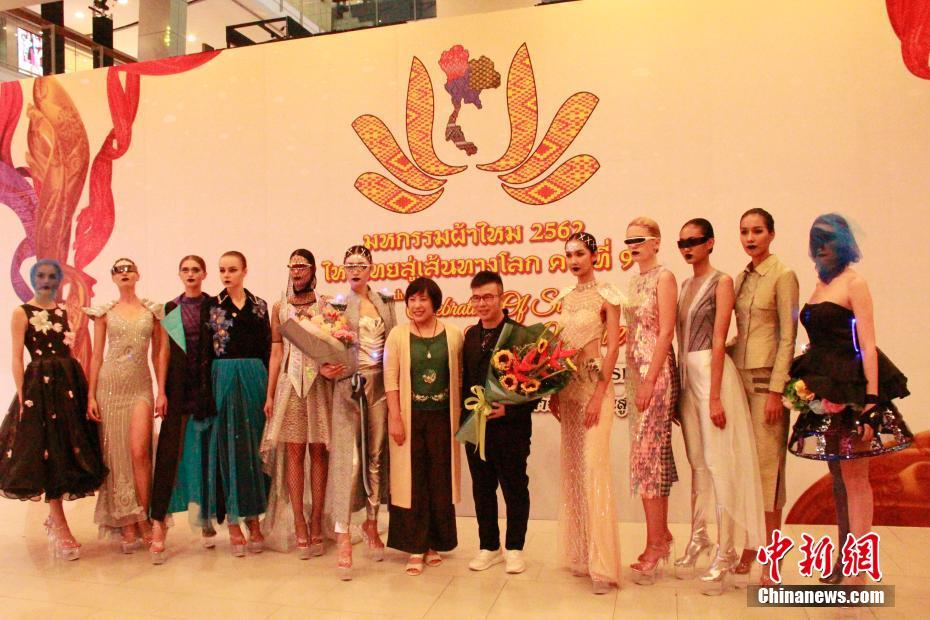 11月19日,中国驻泰国大使夫人潘鹏参赞(左七)、中国知名设计师易茗(左八)与时装模特合影。当天,第九届泰丝服装文化展暨第二届泰丝国际时装周“中国设计师专场”服装秀在曼谷举行,富有中国现代时尚元素的泰丝服饰作品令观众惊艳。中新社发 赵婧楠 摄