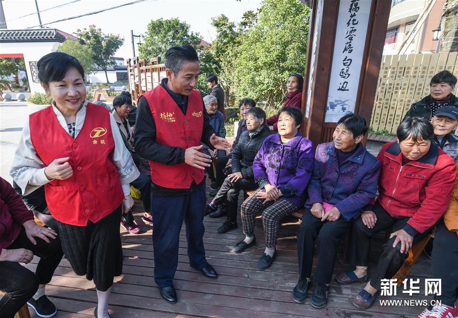 11月20日,志愿者故事员钟红梅(前左一)、徐永革(前左二)在塘栖镇丁河村给村民们用方言讲故事,倡导移风易俗新风尚。新华社记者 徐昱 摄