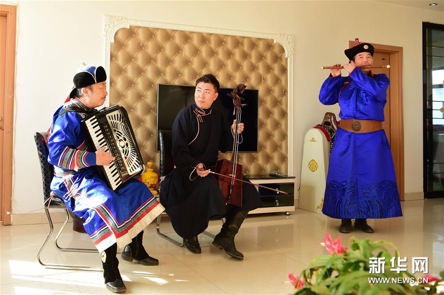 11月21日,乌兰牧骑队员在群众家中表演节目。新华社发(贝赫 摄)