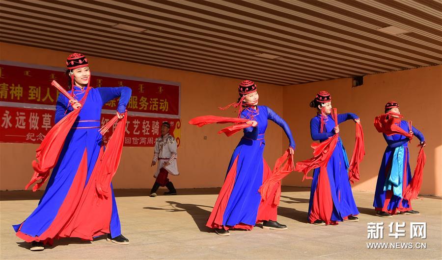 11月21日,乌兰牧骑队员在代钦塔拉嘎查文化广场表演舞蹈。新华社发(贝赫 摄)
